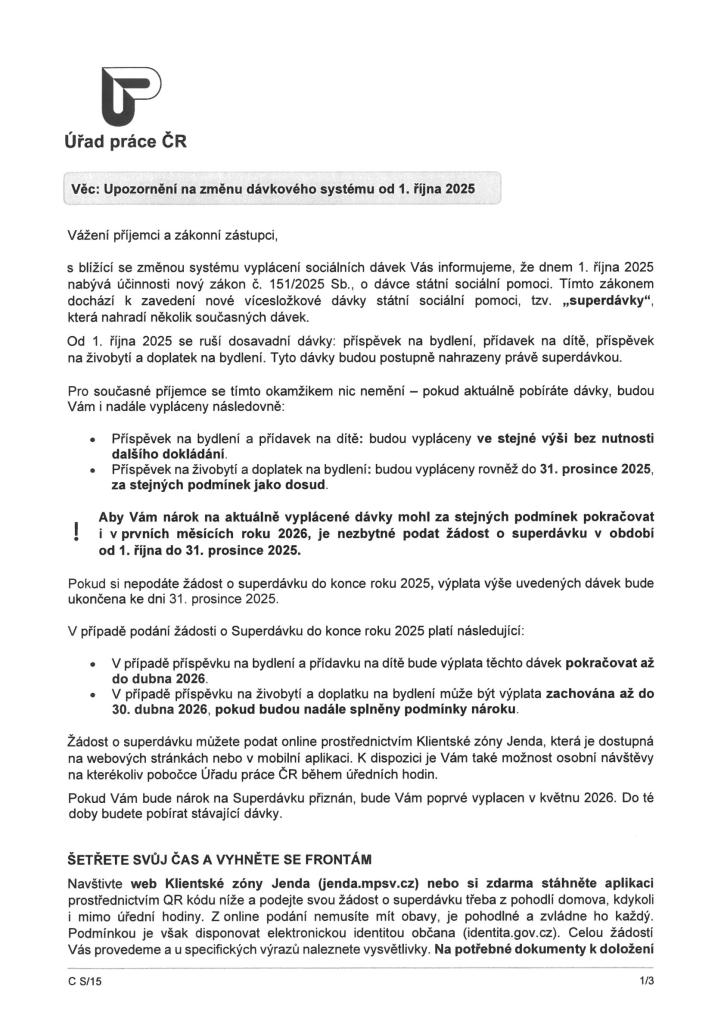 Upozornění na změnu dávkového systému od 1.10.2025